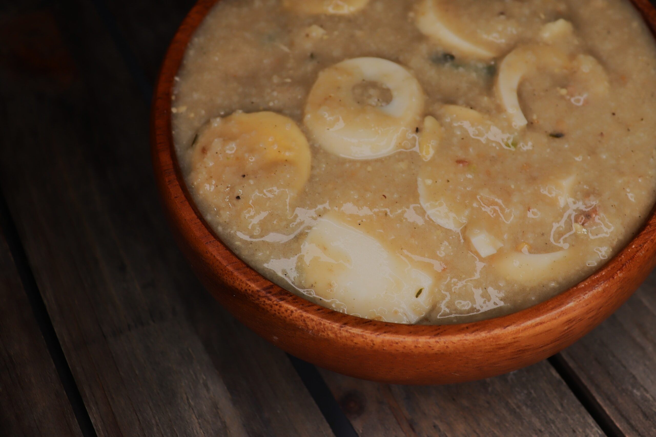 • Add 4 cups reserved chicken broth to a pot, then add uncooked dressing and boiled eggs. Bring to a boil.